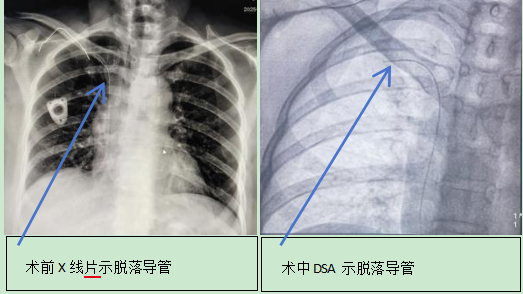 近日,介入治疗科完成一例静脉输液港断裂导管取出手术。该例患者今年3月在外院植入静脉输液港,今年12月8日患者在我院维护输液港时出现回抽无回血,胸片检查提示导管与港座分离,导管一端进入右心室,另一端位于右锁骨下静脉内。经介入科会诊,许哲主任立即组织科室术前讨论,决定实施急诊手术,经右侧股静脉穿刺,使用“猪尾”导管配合异物抓捕器,经反复抓捕,最终顺利取出脱落导管。