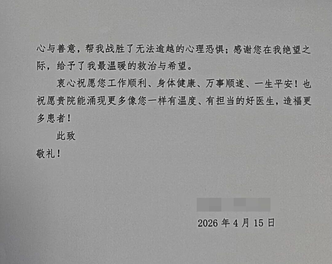一封感谢信,讲述一次跨越恐惧的守护 这封感谢信来自患者张某。他因颈肩疼痛困扰多时,多次就诊后,医生均建议通过核磁共振检查明确病因。然而,患者同时患有严重的幽闭恐惧症,面对封闭的核磁仓,他多次尝试都以失败告终,一度陷入绝望。 在家人的陪伴下,患者抱着最后一丝希望,在2026年4月14日的傍晚,再次来到医院。这一次,他遇见了影像科的孙阿永嘎医生。 那天,孙阿永嘎医生从中午12点半接班,接连完成了所有预约患者的检查。时针已经指向19点,当他处理完最后一份工作,刚收拾好东西准备下班时,患者一家焦急地找到了他。 听完患者反复尝试核磁检查失败、因幽闭恐惧濒临绝望的经历,孙阿永嘎医生没有丝毫推诿,也没有用“流程”与“规定”回应患者的无助。面对这个特殊又棘手的病例,他当即停下脚步,温和却坚定地说:“别着急,我给你加班做。” 耐心陪伴4次进出,他用温柔接住患者的崩溃 为了让患者张某平复情绪,孙阿永嘎医生特意留出时间,陪着张某某和他的家人沟通,指导家属如何配合安抚患者情绪。等待的一个小时里,他始终语气温柔,一点点帮患者卸下心理防线。 进入核磁仓后,熟悉的幽闭感仍一次次袭来,患者因恐惧四次中断检查。每一次,孙医生都没有半句催促,而是亲自走进核磁室,轻声询问感受、耐心安抚情绪,陪患者做好心理建设后,再陪着他继续检查。 全程近一个小时的检查,他没有一句怨言,用远超常人的耐心与同理心,一点点驱散患者内心的恐惧,陪着他完成了这场“特殊的战斗”。 最终,患者成功完成了颈椎核磁共振检查,为后续的诊断治疗扫清了最大障碍。这份跨越恐惧的守护,让患者在感谢信中写下:“您用责任与耐心,守住了我最后的就医希望,这份医者情怀,让我终生难忘!” 以患者为中心,让医疗服务更有温度 在呼伦贝尔市人民医院,“以患者为中心”从来不是一句口号,而是融入每一位医护人员日常的行动。 面对特殊患者的困境,孙阿永嘎医生用一次主动加班、全程陪伴与无限耐心,诠释了“医者仁心”的真正含义——医术治病,仁心暖心。他用理解与包容,打破了冰冷的流程壁垒;用责任与担当,守护了患者的就医希望。 今后,呼伦贝尔市人民医院将继续秉持“以人为本”的服务理念,不断提升医疗服务质量与人文关怀水平,让每一位患者都能在就医过程中感受到温暖与尊重,让更多这样的暖心故事,在医院的各个角落发生。