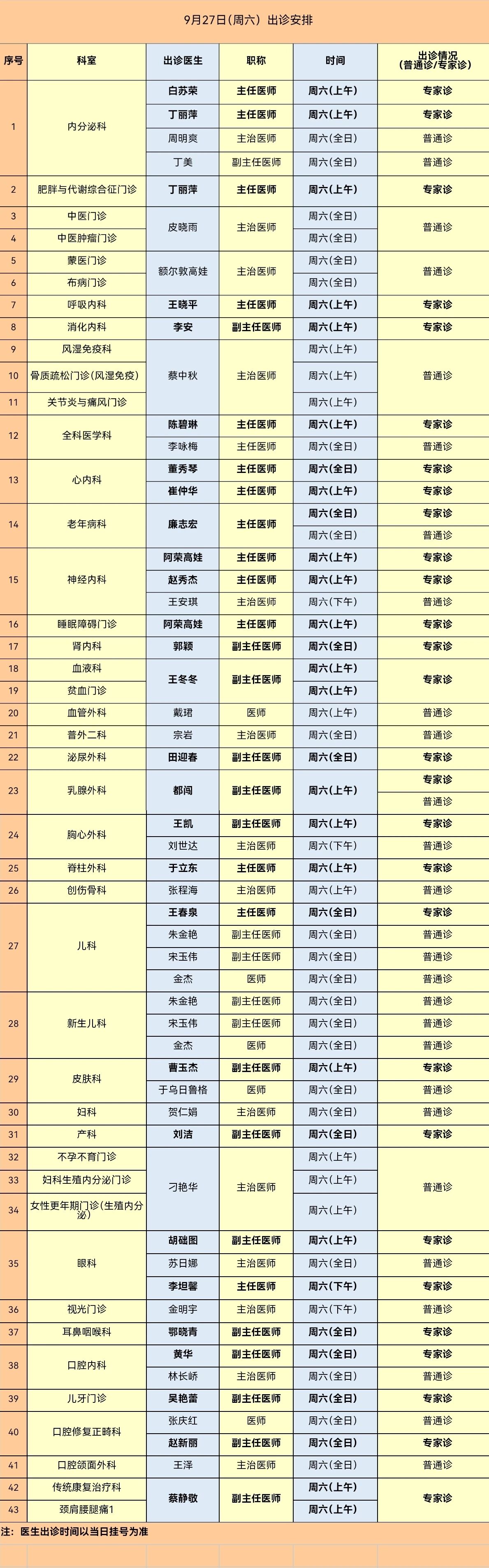 呼伦贝尔市人民医院9月27日(周六)出诊安排