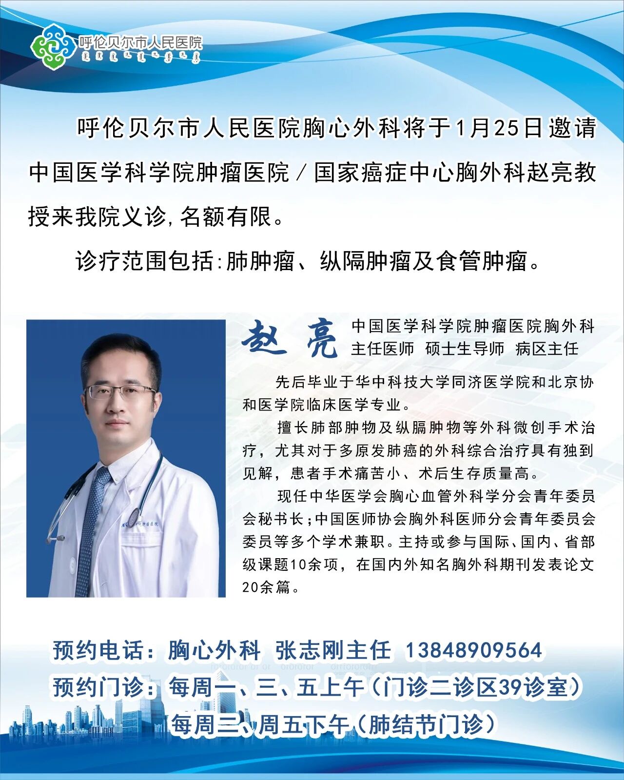 呼伦贝尔市人民医院胸心外科将于1月25日邀请中国医学科学院肿瘤医院/国家癌症中心胸外科赵亮教授来院义诊
