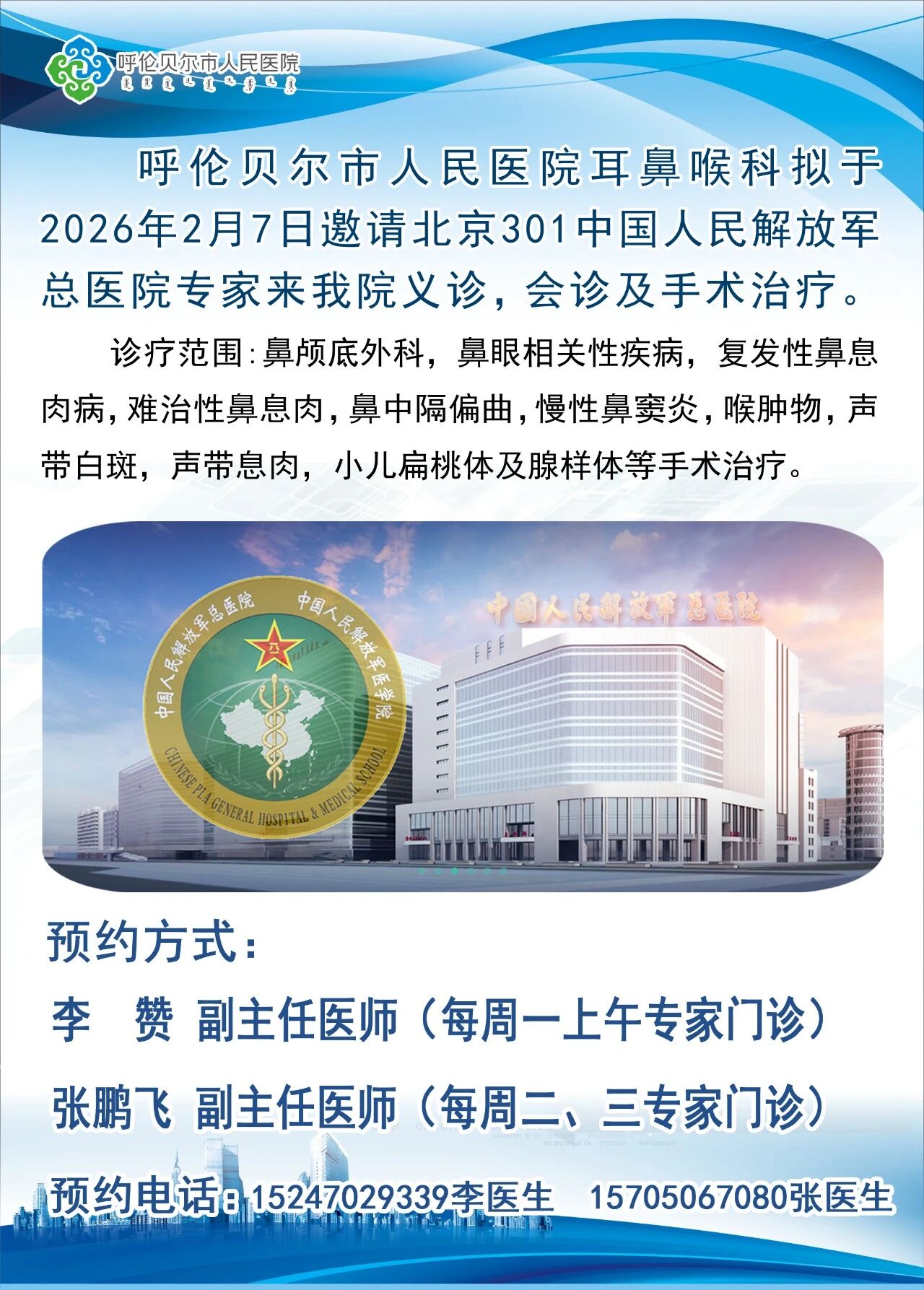 呼伦贝尔市人民医院耳鼻喉科拟于2月7日邀请北京301中国人民解放军总医院专家来院义诊