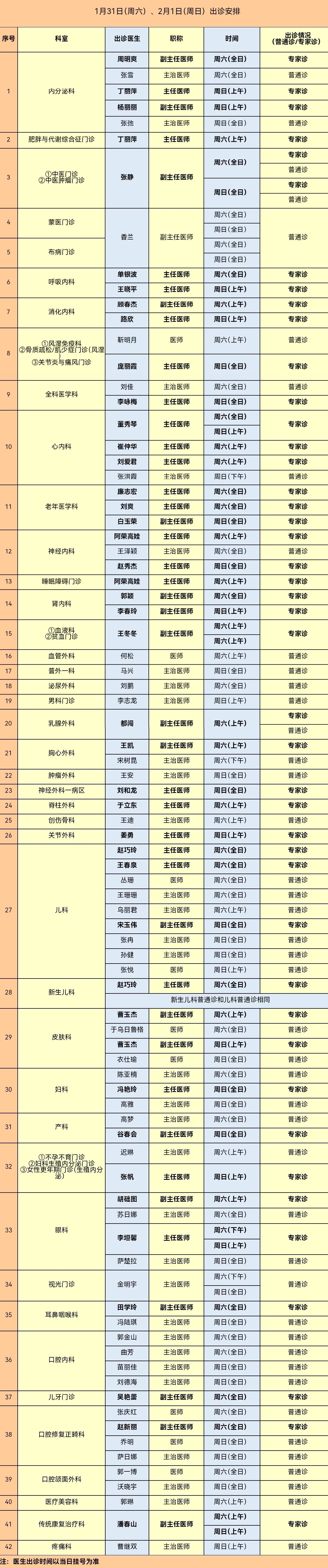 呼伦贝尔市人民医院1月31日(周六)、2月1日(周日)出诊安排