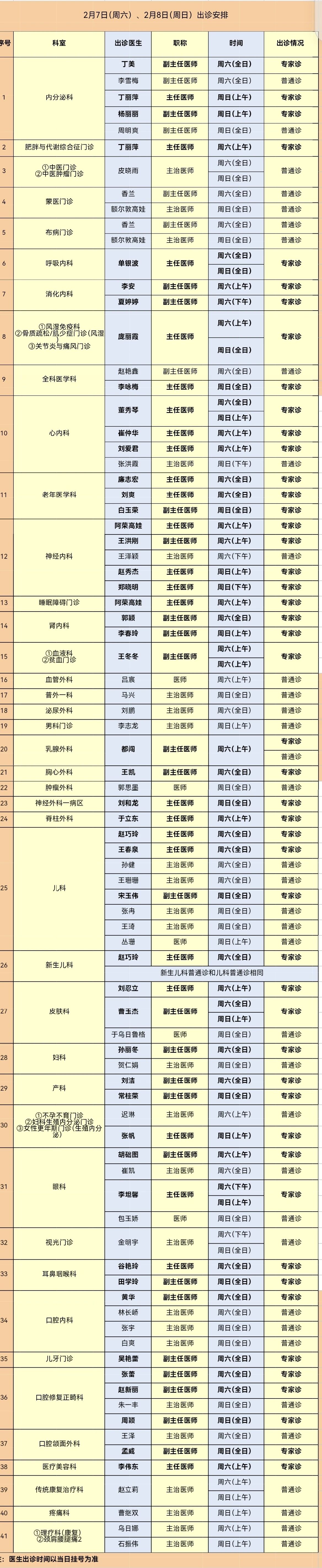 呼伦贝尔市人民医院2月7日(周六)、2月8日(周日)出诊安排