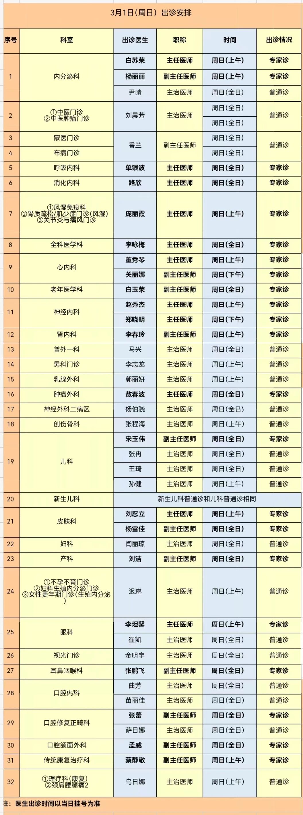 呼伦贝尔市人民医院3月1日(周日)出诊安排