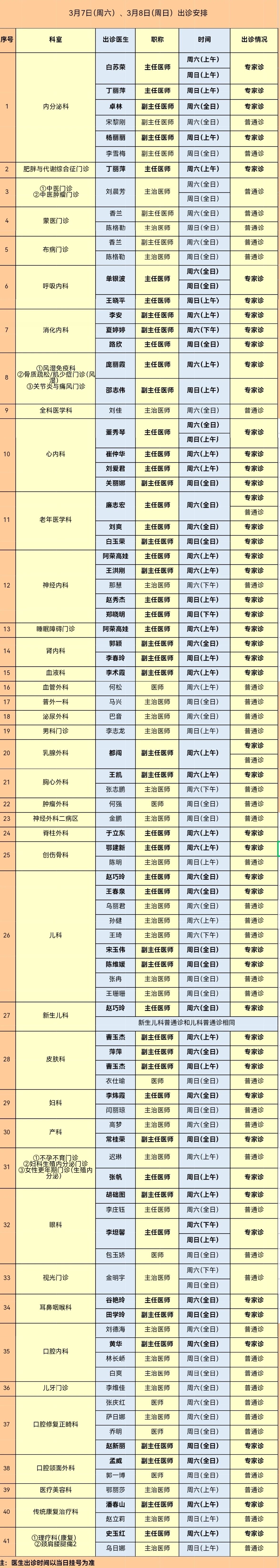 呼伦贝尔市人民医院3月7日(周六)、3月8日(周日)出诊安排