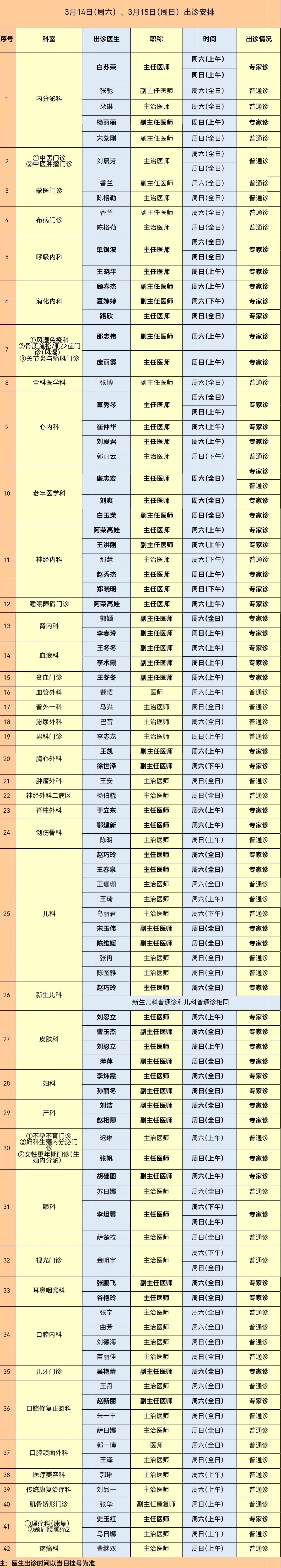 呼伦贝尔市人民医院3月14日(周六)、3月15日(周日)出诊安排