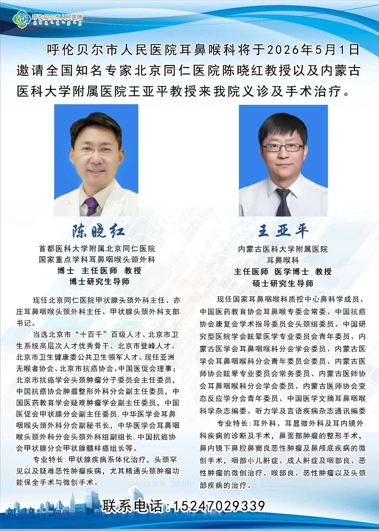 呼伦贝尔市人民医院耳鼻喉科将于5月1日邀请北京同仁医院陈晓红教授、内蒙古医科大学附属医院王亚平教授来院开展义诊及手术