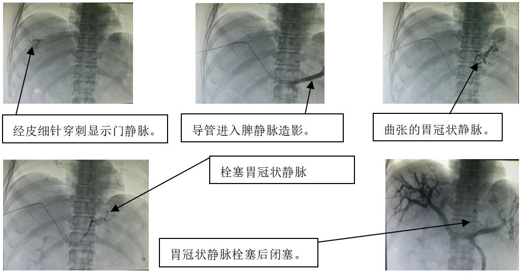 54岁患者,2014年诊断肝硬化失代偿期,曾于2014年、2019、2025年消化道出血住院治疗,多次行食管静脉曲张镜下套扎及组织胶注射治疗,3月25日再次出现呕血,量约1000毫升,许哲主任组织科内医生一起分析患者的临床表现、影像学及其它相关检查后诊断为患者为肝硬化门脉高压引起胃底、食管静脉曲张破裂出血,随时有生命危险,可以采取经皮经肝胃冠状静脉栓塞术止血,即经皮经肝穿刺门静脉,进入脾静脉造影,找到曲张的胃冠状静脉分支,运用导管进行栓塞止血。