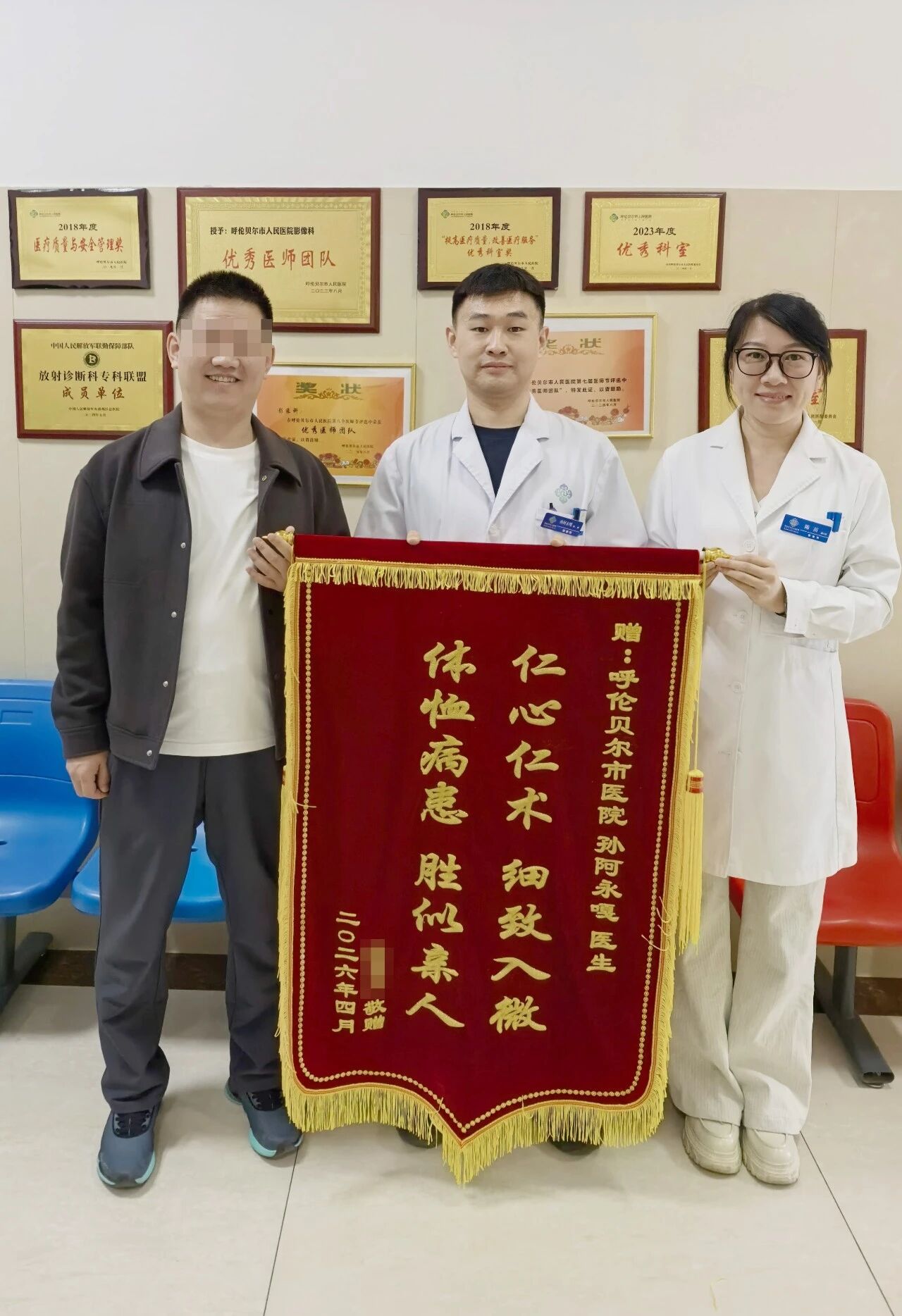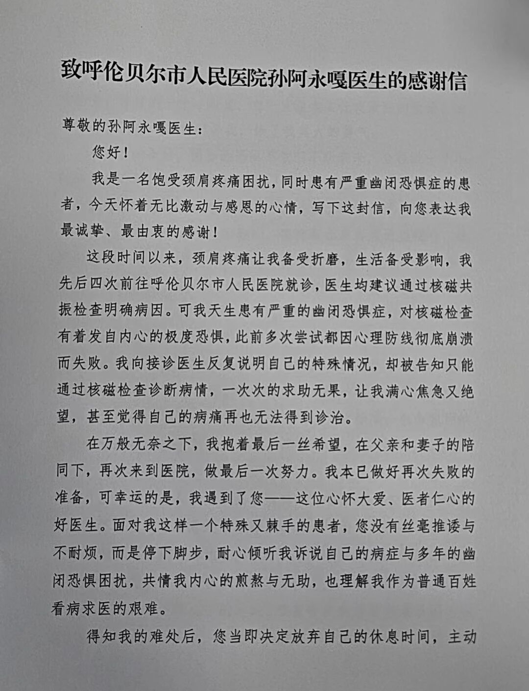 一封感谢信,讲述一次跨越恐惧的守护 这封感谢信来自患者张某。他因颈肩疼痛困扰多时,多次就诊后,医生均建议通过核磁共振检查明确病因。然而,患者同时患有严重的幽闭恐惧症,面对封闭的核磁仓,他多次尝试都以失败告终,一度陷入绝望。 在家人的陪伴下,患者抱着最后一丝希望,在2026年4月14日的傍晚,再次来到医院。这一次,他遇见了影像科的孙阿永嘎医生。 那天,孙阿永嘎医生从中午12点半接班,接连完成了所有预约患者的检查。时针已经指向19点,当他处理完最后一份工作,刚收拾好东西准备下班时,患者一家焦急地找到了他。 听完患者反复尝试核磁检查失败、因幽闭恐惧濒临绝望的经历,孙阿永嘎医生没有丝毫推诿,也没有用“流程”与“规定”回应患者的无助。面对这个特殊又棘手的病例,他当即停下脚步,温和却坚定地说:“别着急,我给你加班做。” 耐心陪伴4次进出,他用温柔接住患者的崩溃 为了让患者张某平复情绪,孙阿永嘎医生特意留出时间,陪着张某某和他的家人沟通,指导家属如何配合安抚患者情绪。等待的一个小时里,他始终语气温柔,一点点帮患者卸下心理防线。 进入核磁仓后,熟悉的幽闭感仍一次次袭来,患者因恐惧四次中断检查。每一次,孙医生都没有半句催促,而是亲自走进核磁室,轻声询问感受、耐心安抚情绪,陪患者做好心理建设后,再陪着他继续检查。 全程近一个小时的检查,他没有一句怨言,用远超常人的耐心与同理心,一点点驱散患者内心的恐惧,陪着他完成了这场“特殊的战斗”。 最终,患者成功完成了颈椎核磁共振检查,为后续的诊断治疗扫清了最大障碍。这份跨越恐惧的守护,让患者在感谢信中写下:“您用责任与耐心,守住了我最后的就医希望,这份医者情怀,让我终生难忘!” 以患者为中心,让医疗服务更有温度 在呼伦贝尔市人民医院,“以患者为中心”从来不是一句口号,而是融入每一位医护人员日常的行动。 面对特殊患者的困境,孙阿永嘎医生用一次主动加班、全程陪伴与无限耐心,诠释了“医者仁心”的真正含义——医术治病,仁心暖心。他用理解与包容,打破了冰冷的流程壁垒;用责任与担当,守护了患者的就医希望。 今后,呼伦贝尔市人民医院将继续秉持“以人为本”的服务理念,不断提升医疗服务质量与人文关怀水平,让每一位患者都能在就医过程中感受到温暖与尊重,让更多这样的暖心故事,在医院的各个角落发生。