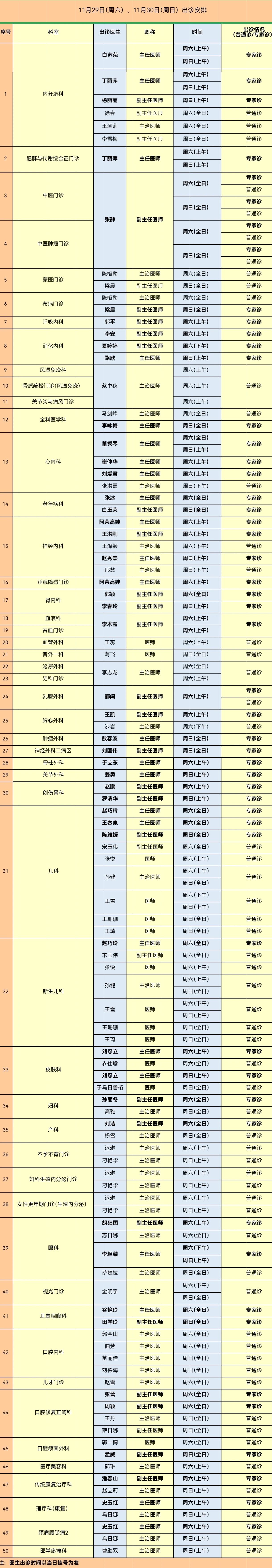 呼伦贝尔市人民医院11月29日(周六)、11月30日(周日)出诊安排